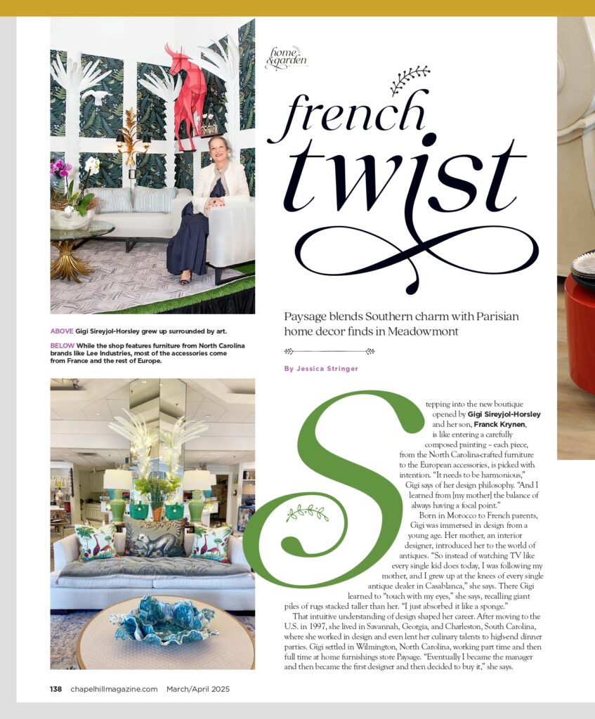 Sponsor of the Month By Sherri Robinson Before we introduce you to Paysage Home, let us set the mood, deliver a bit of ambiance. Take a moment, close your eyes and open your imagination; now, listen deeply, allow the incomparable voice of Édith Piaf, or Marlene Dietrich, or Madeleine Peyrouxto invade your soul with the haunting […]