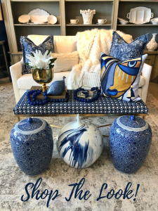 Recycled glass beads – $75       Blue Hydrangea Pillow – $105      Aged Gold Vase – $50