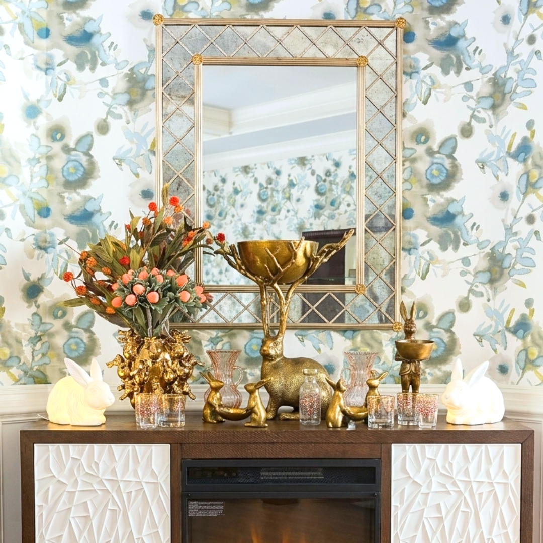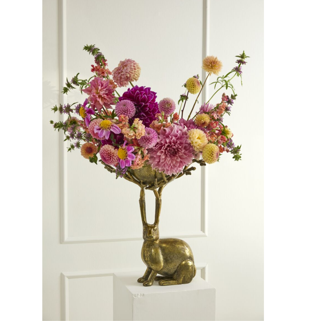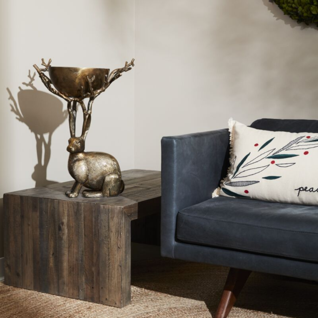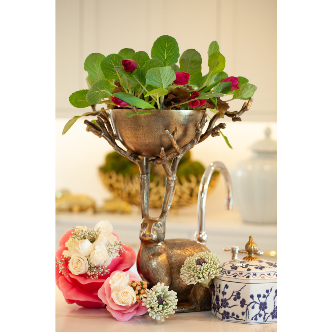Make a sculptural statement with this brass-finished aluminum bowl. Supported by a regal hare whose long ears extend into sprawling, organic branches, this piece is the perfect blend of nature-inspired art and functional decor. Whether used as a grand Easter centerpiece filled with moss and eggs or a year-round fruit bowl on a kitchen island, it brings immediate height and sophisticated energy to any room.