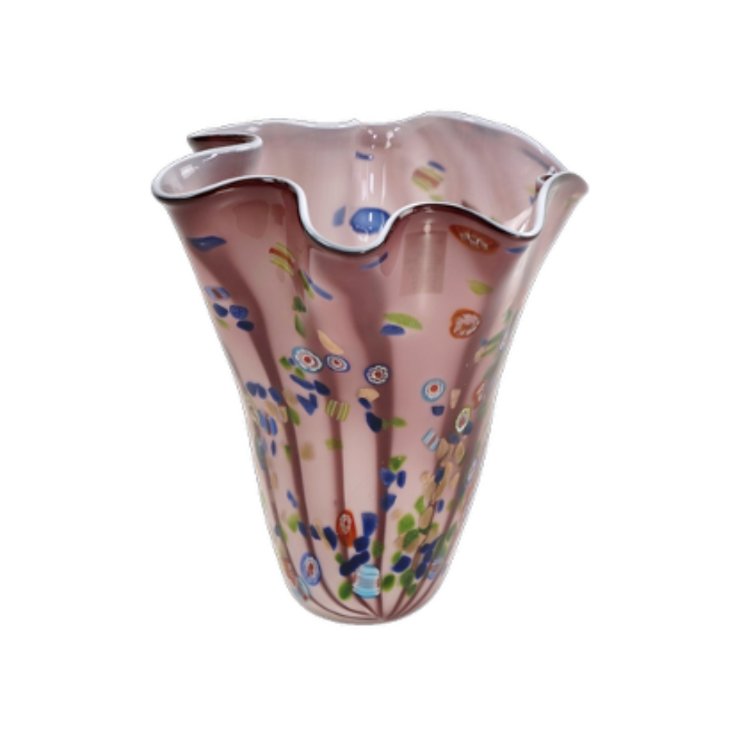 Make a vibrant statement with the I Punti glass vase, a playful masterpiece of color and light. Its soft pink base is speckled with a joyful confetti of multicoloured accents, while the elegant ruffled rim adds a whimsical, organic movement. This handmade “luxe” piece celebrates individuality, with slight variations making every vase a one-of-a-kind treasure for your home.