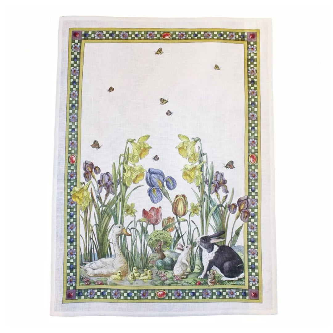 Get ready for spring with our charming Bunny Garden tea towel! This delightful design features a vibrant array of daffodils, irises, and tulips, intertwined with playful spring creatures. You’ll find adorable ducks and ducklings paddling in the pond, while curious bunnies peek out from the lush foliage. The striking checkerboard and daisy border adds a touch of classic sophistication. Perfect for your spring kitchen or as a thoughtful Easter gift, this tea towel will bring joy to any space!