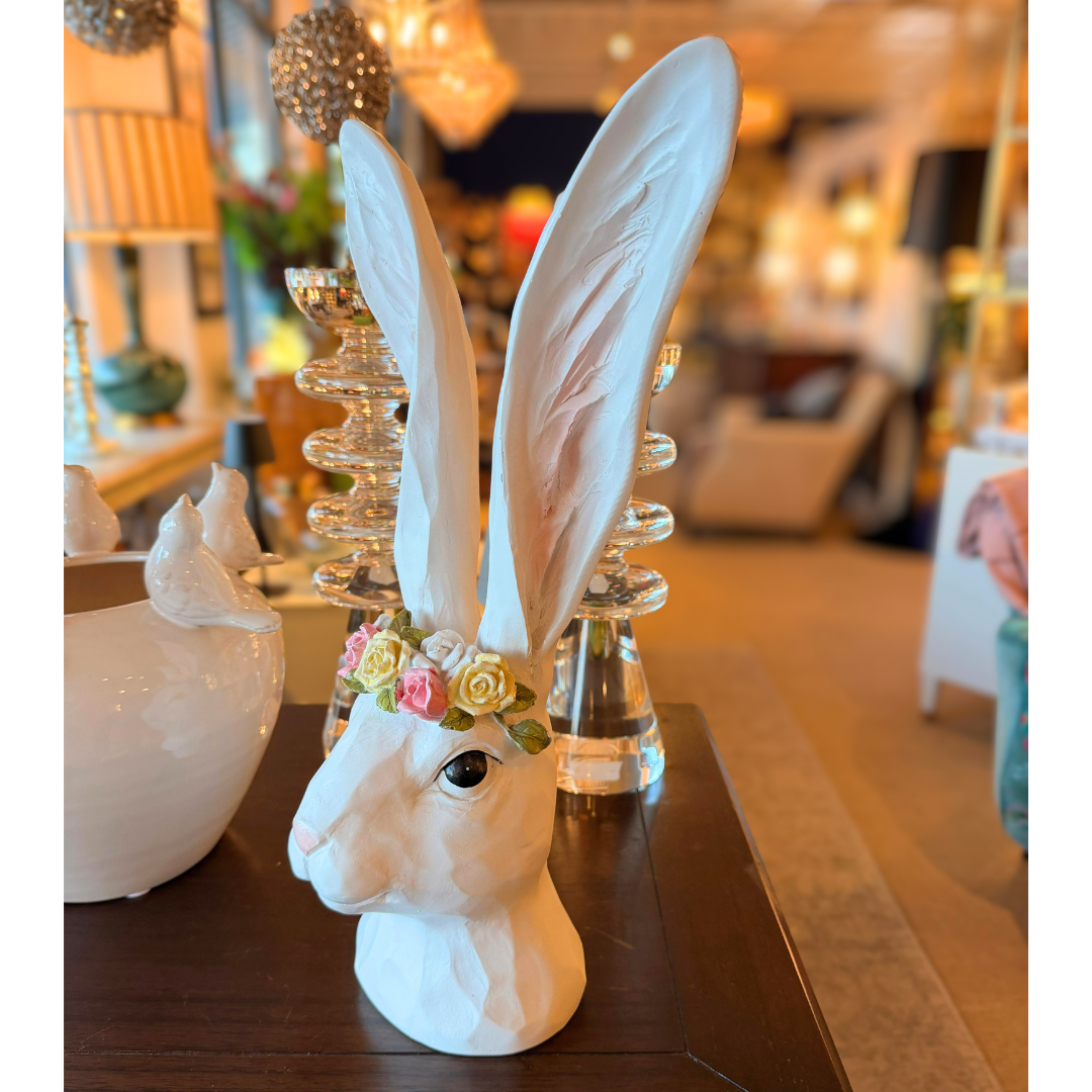 Elevate your Easter decor with a touch of effortless chic and high-end charm! This elegant polyresin bust is a true seasonal gem, featuring a sophisticated white finish and an artfully crafted, colorful flower wreath. With its graceful pose and precise detail, it creates a refined ambiance on any mantle or sideboard. A stunning statement piece that perfectly captures the blooming energy of spring!