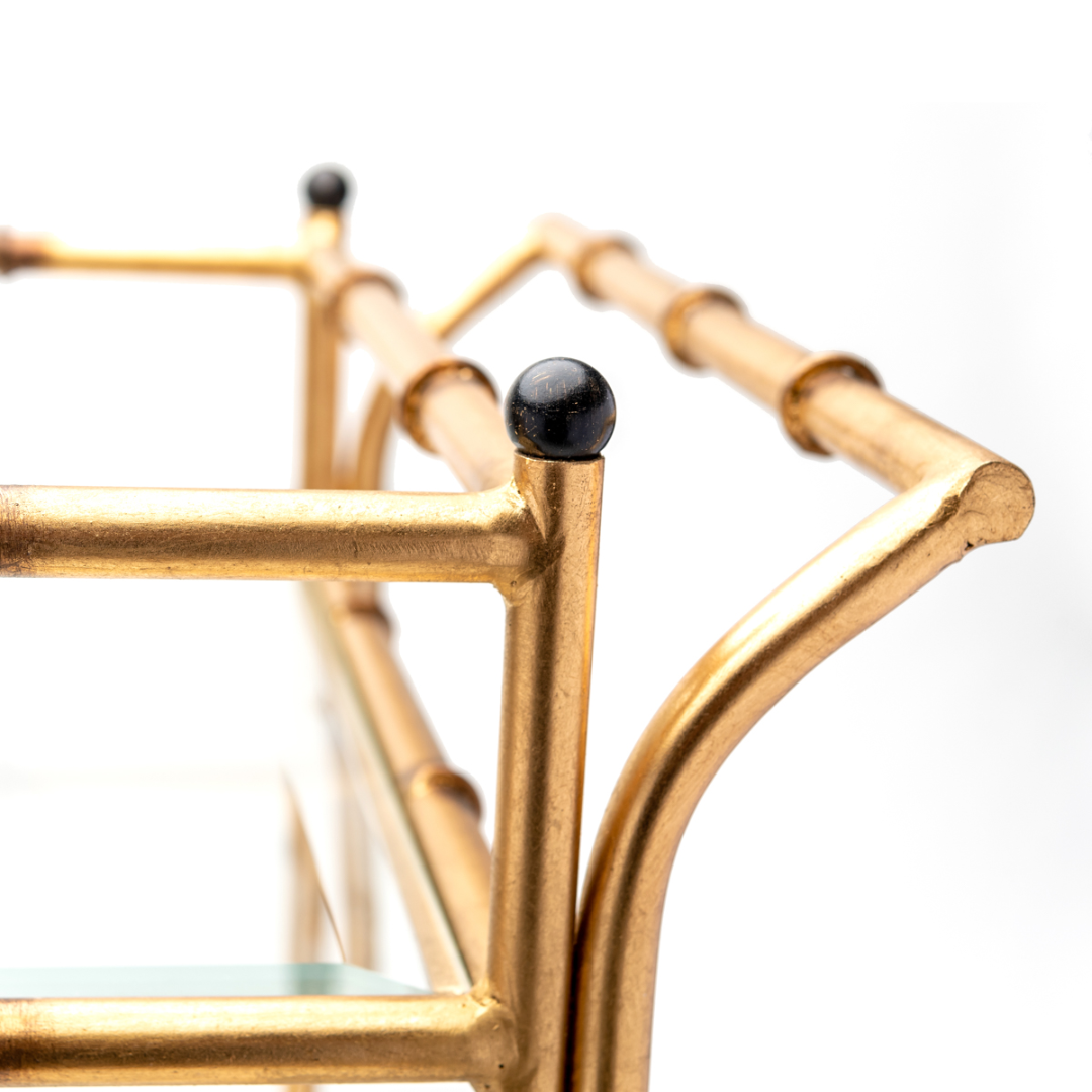 Ready to bring the party to your guests? This Asian-inspired tea cart features a chic bamboo design in a stunning Antique Gold finish that is sure to turn heads. Whether you’re serving afternoon tea, finger sandwiches, or late-night cocktails, do it in style with two clear glass shelves equipped with rails to keep your glassware secure. With smooth caster wheels, you can glide from the kitchen to the lounge without a spill in sight. It’s the ultimate “centerpiece in motion” for the perfect host!