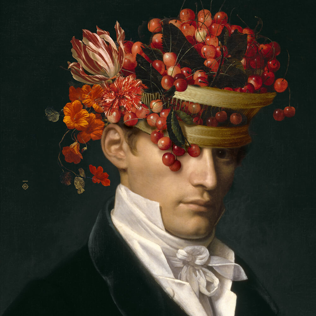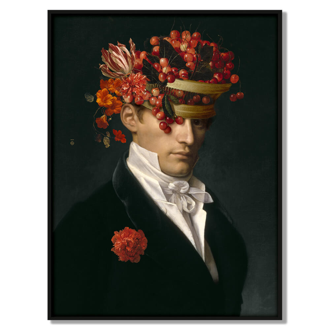 A limited and numbered edition by designers Rachel & Benoît Convers, Aimé blends theatrical portraiture with 17th-century still life. Adorned with fruits and flowers, the vibrant crimson headdress creates a stunning contrast against a dark, moody background. This refined artwork is made in France on aluminum dibond and includes a signed certificate of authenticity.