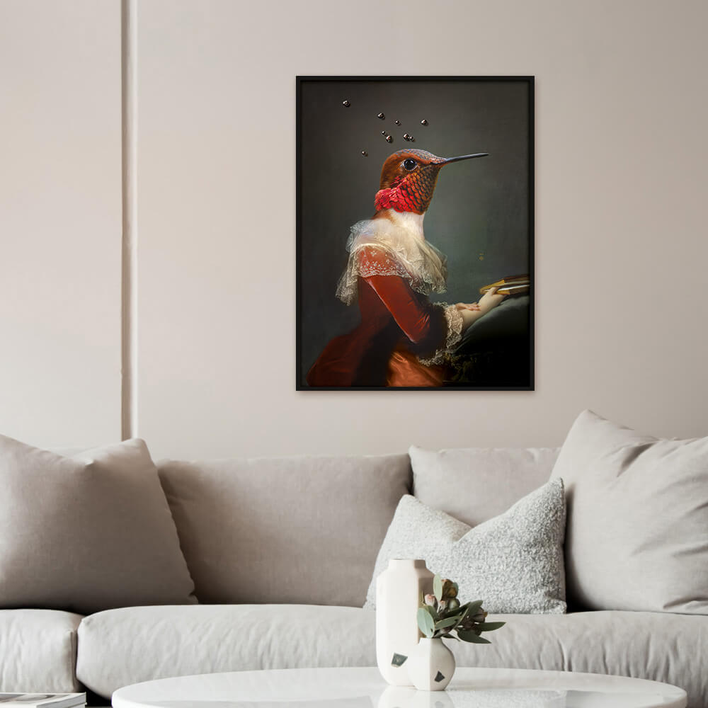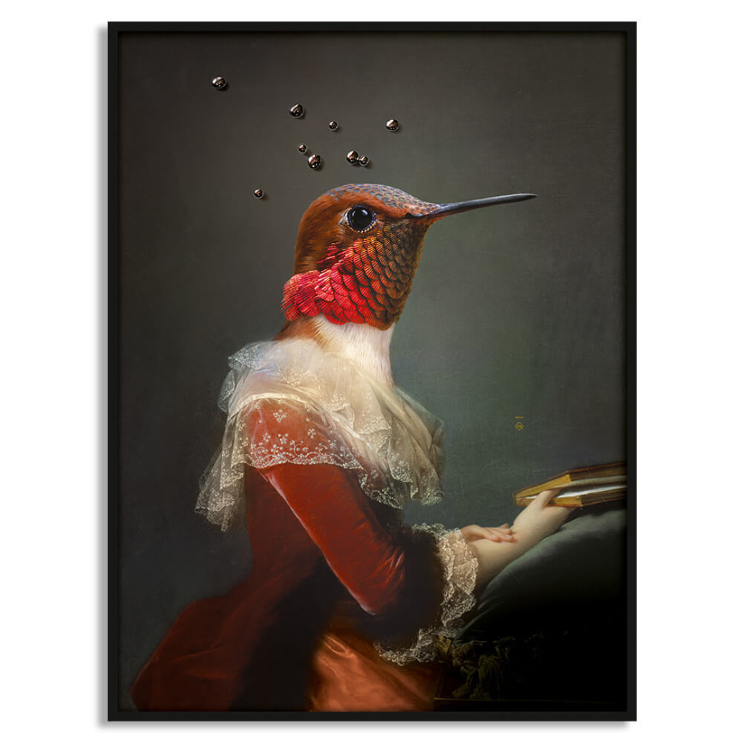A limited and numbered edition by designers Rachel & Benoît Convers, Angèle is a captivating companion to the collection’s beloved hummingbird, Ambroise. Defined by a gentle and mysterious gaze, this timeless portrait acts as a discreet interior companion that blends elegantly into any living space. Each unique framed piece serves as an art statement evoking subtle narratives and is delivered with a certificate of authenticity signed by the designer.