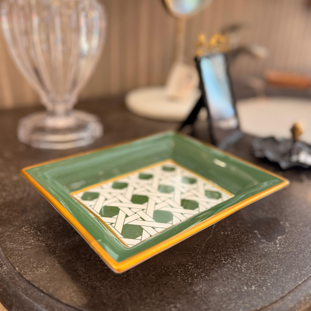 Keep your treasures organized with this glossy porcelain dish featuring a crisp white cane webbing motif and a hand-painted gold rim. This emerald-toned stunner is the perfect sophisticated nod to St. Patrick’s Day, offering a “lucky” upgrade for your entryway or vanity without the kitsch. Whether it’s holding your favorite green gemstones or catching keys at the end of the rainbow, its vibrant hue and intricate lattice design bring timeless Irish charm to your home all year long.