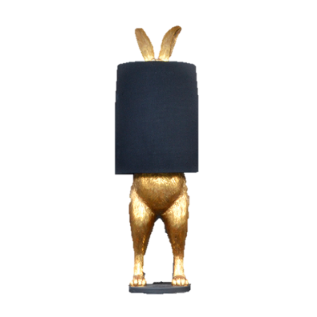 Light up your space with a quirky twist! This tall lamp features a gleaming gold bunny base peeking out from beneath a sleek black shade, blending whimsy with modern elegance. Perfect as a playful statement piece, it brings charm and a dash of unexpected fun to any room. Hop into style and brighten your décor with this bold, delightful lamp!