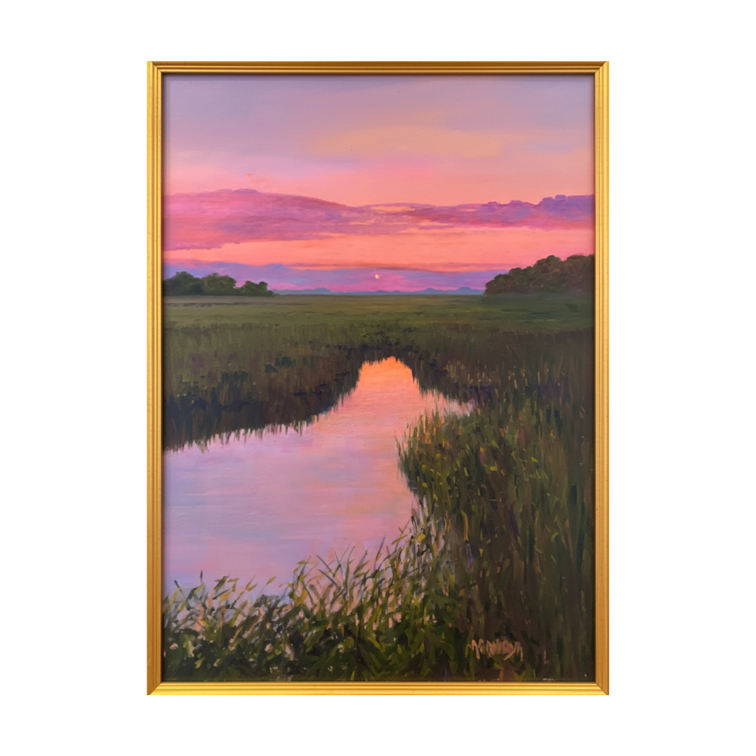 Turn your wall into a front-row seat for the best sunset in the South with Whispers of Tranquility by our Artist of the Month, Amy Gaweda. This painting is a radiant neon-pastel dream of glowing marshes and electric skies that captures the Lowcountry at its peak magic. With its mirror-smooth reflections and high-energy hues, it’s the ultimate vibrant and velvety statement piece for any room needing a mood boost.