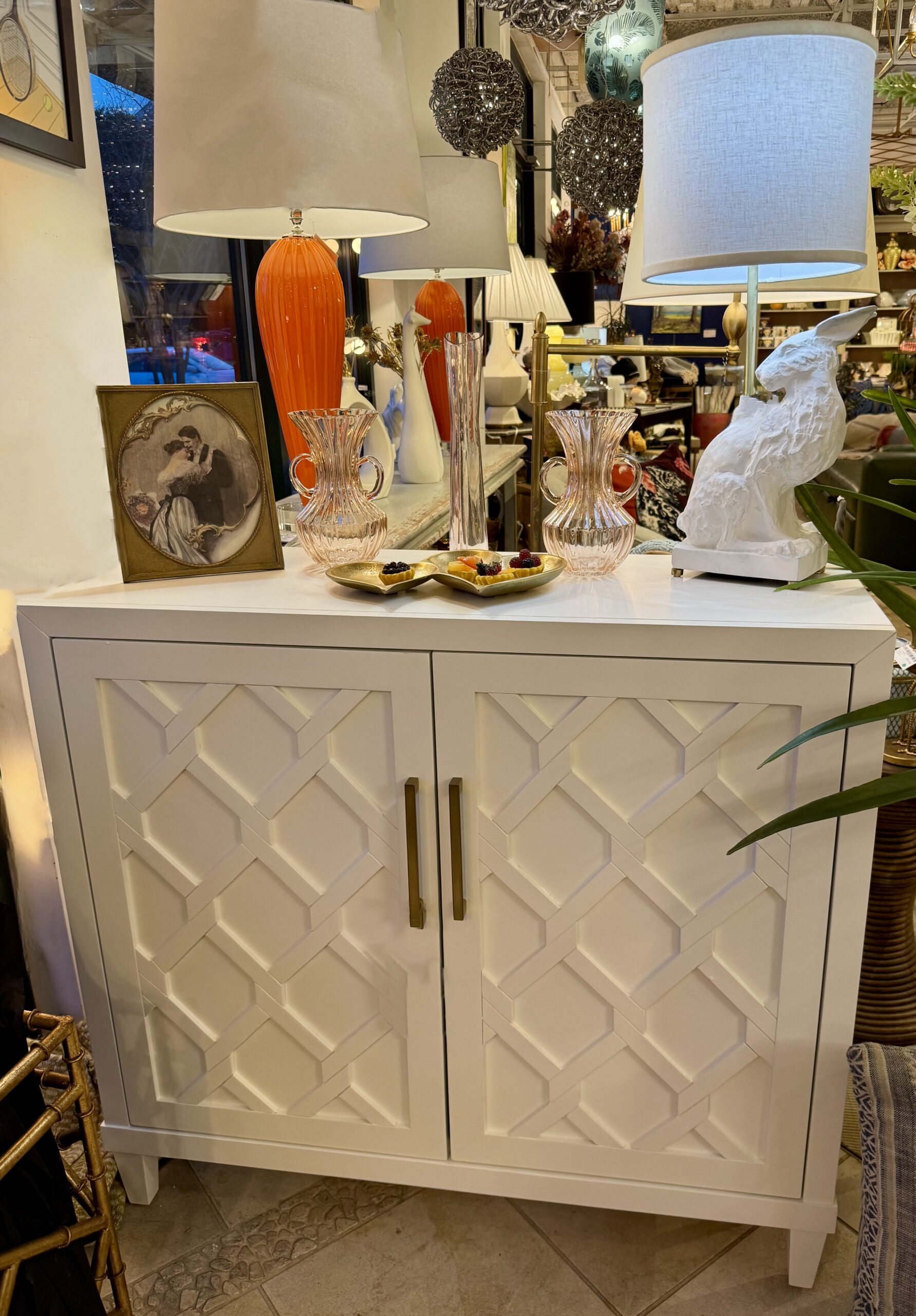 Handcrafted from cast aluminum, showcasing a matte white finish and brass accents. It is topped with a hardback fabric shade for an elegant touch.